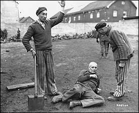 Newly liberated Dachau prisoners heap insults on an SS guard after knocking him to the ground.(Army Signal Corps Photo) |