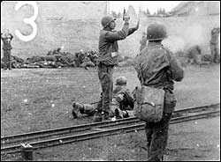 Lt. Col. Felix Sparks fires his pistol into the air to stop his troops from shooting their German prisoners.(Photo courtesy of Arthur W. Lee Jr.) |