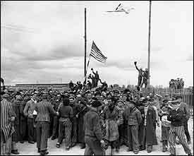 Dachau prisoners raised a flag they had made after their liberation by members of the US Seventh Army.(Army Signal Corps Photo) |